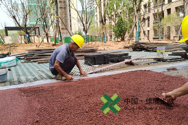 將定量石子,水泥,膠結(jié)劑,水投入攪拌均勻,鋪裝前用水濕潤路基,墊層需要振搗平整,面層用水泥抹平機收光抹平,施工后用農(nóng)膜進行覆蓋養(yǎng)生兩天后灑水養(yǎng)護,時間約五到七天,期間應(yīng)設(shè)隔離帶,避免行人通過,面層干燥后噴涂面層封閉劑(又稱面罩劑)。