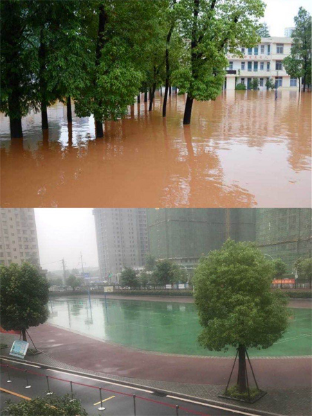 今年的雨量特別多,大量河流超警戒水位,但是鋼城二中入梅以來,校園的積水大部分不超過15厘米,基本半小時退水!因為2016年9月鋼城二中改造工程啟動,5年的建設(shè)成果在今年的雨季得到了驗證!的雨水為解決雨季積水問題,以海綿城市建設(shè)標準打造!校內(nèi)設(shè)了約400立方米的雨水調(diào)蓄池,安裝了水泵,雨水被收集到調(diào)蓄池后往外排;車行道、停車位、人行道和活動場地均改用了透水材料;學校外沿打造了生態(tài)旱溪等自然排水系統(tǒng),截流外來倒灌水至調(diào)蓄池后外排。